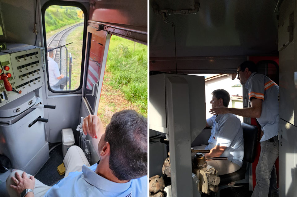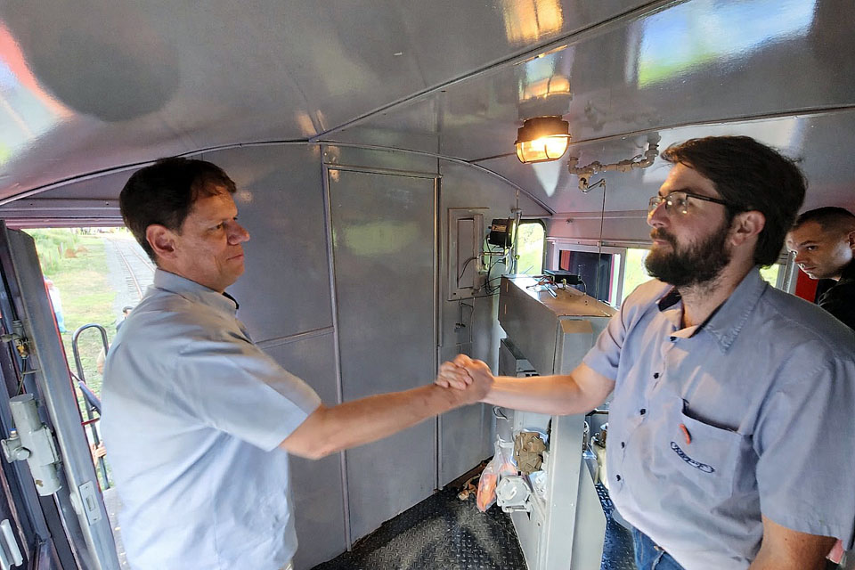 Na ocasião, pudemos apresentar o nosso projeto para ele e a sua comitiva. E não ficou só nisso: todos embarcaram no trem e fizeram o passeio! Para tornar a ocasião ainda mais especial, o governador pôs a mão na massa e conduziu o trem!!!