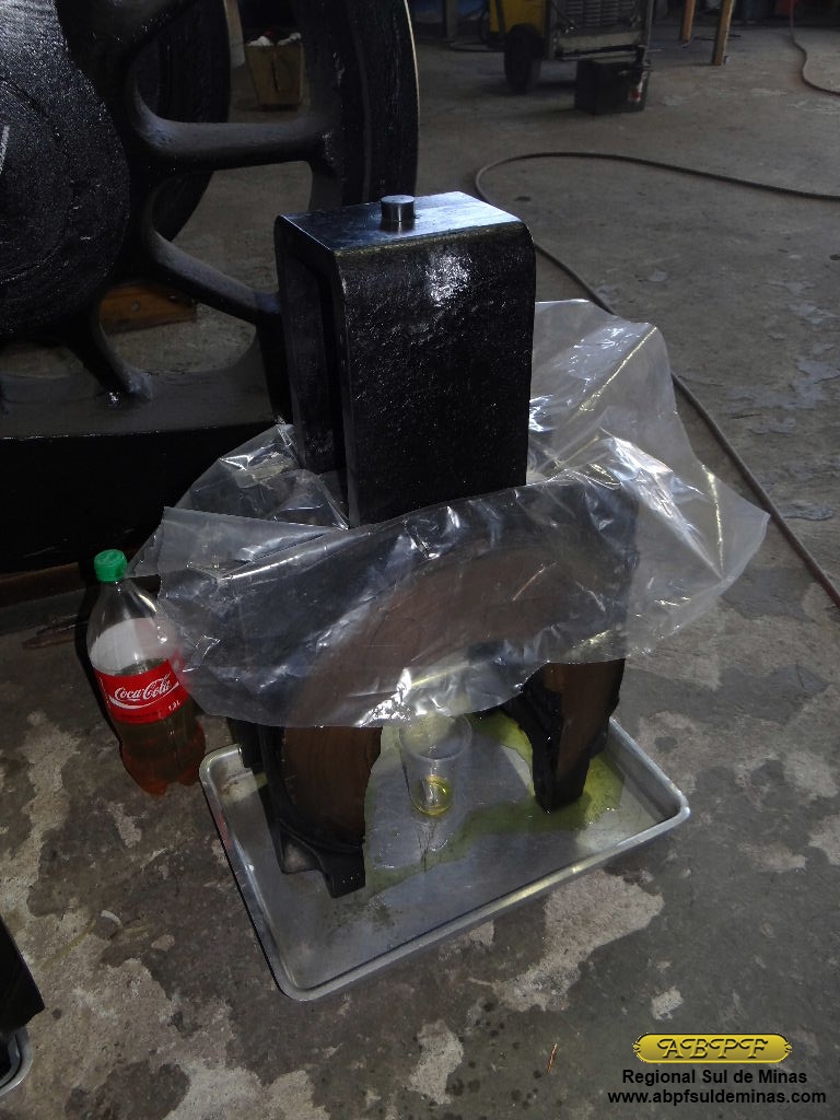 Após o reparo das caixas, constatou-se que o reservatório de óleo para a cunha e a telha haviam sido inutilizados, provavelmente pela locomotiva 522 nos seus últimos anos ter ficado restrita a apenas serviços de manobras. Iniciou-se então o trabalho para se recuperar os reservatórios. Para tal, foi preciso fazer a nova furação para passagem do óleo e refazer as “torcidas” (enchimento) para controle da vazão do óleo. As torcidas são feitas com arame e lã de carneiro: