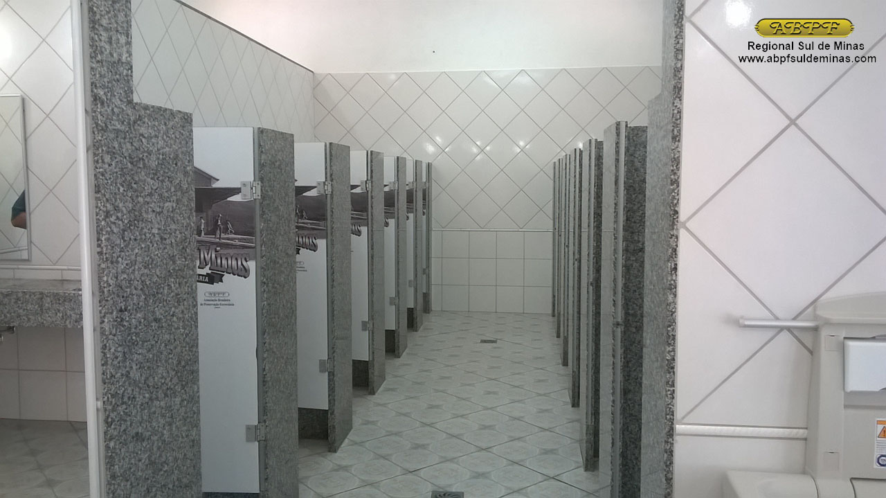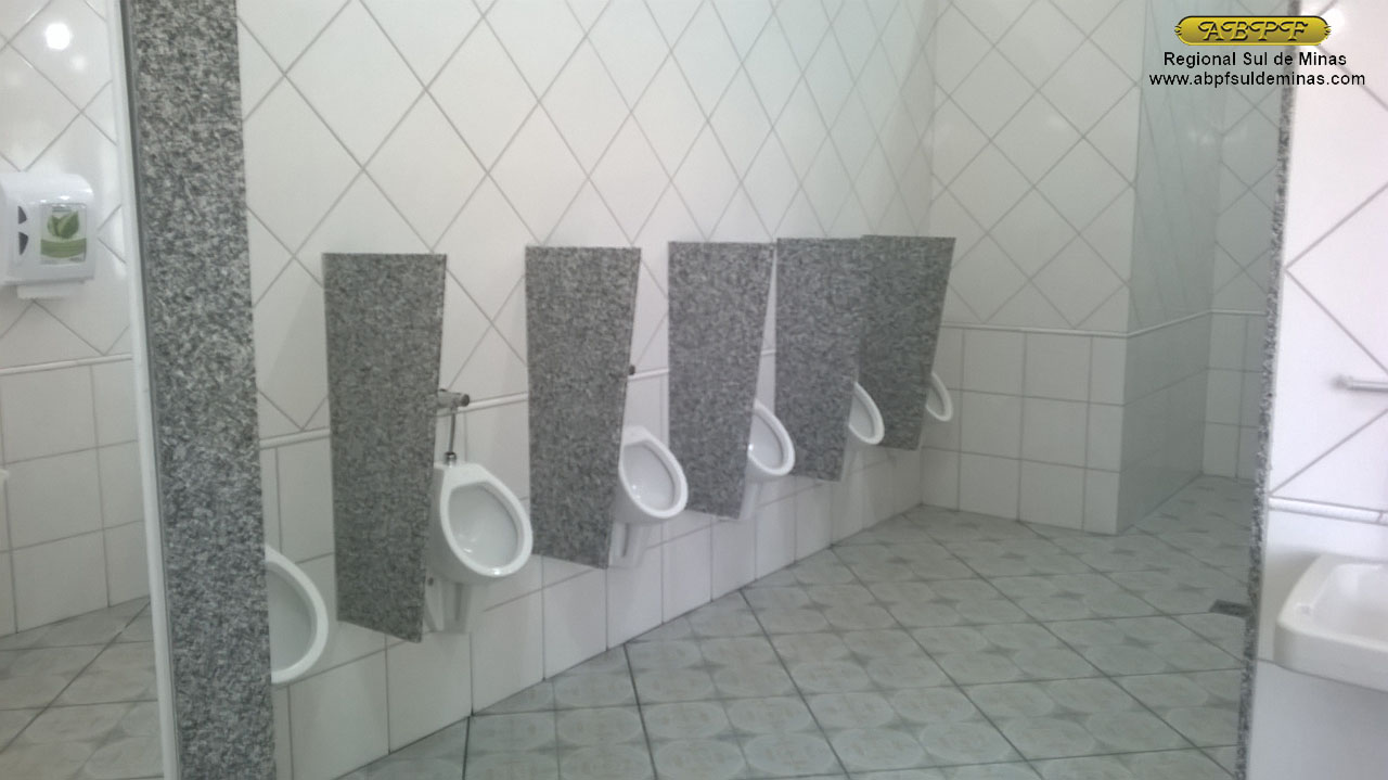 Aspecto do banheiro masculino já concluído com revestimento e piso cerâmico, saídas para escoamento d’água para facilitar a limpeza, mictórios individuais com divisórias; os vasos sanitários também possuem cabines individuais e são separadas da área dos lavatórios garantido condições adequadas de higiene