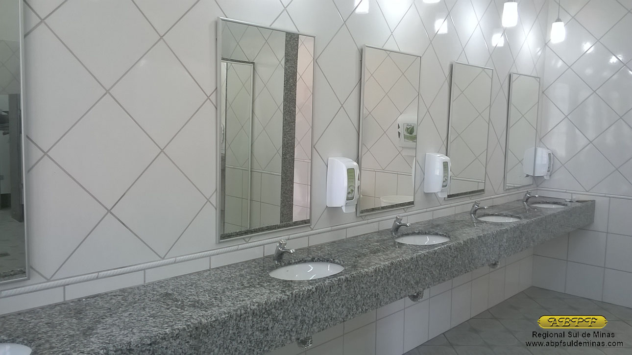 Aspecto do banheiro feminino já concluído, com revestimento e piso cerâmico, saídas para escoamento d’água para facilitar a limpeza, cabines individuais para os vasos sanitários separadas da área dos lavatórios garantido condições adequadas de higiene