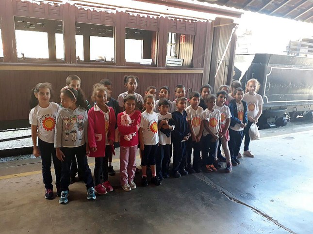 Os alunos da Escola Estadual Presidente Roosevelt já embarcados no trem prontos para realizar o passeio