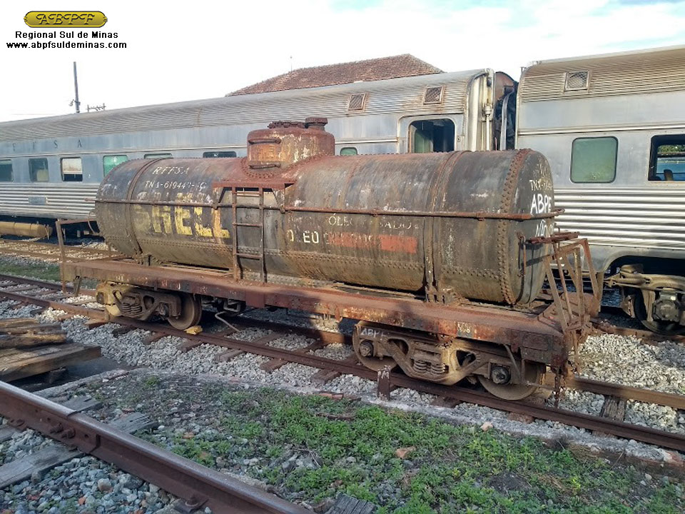 Vagão tanque TNA-619449-4G – Fabricado na Bélgica pela GREGG CAR CO LTD em 1936 para a SHELL que o alocou para transportes na malha da Leopoldina, onde recebeu a matrícula TZV-599. Foi vendido para a A.G.E.F. – Rede Federal de Armazéns Gerais Ferroviários S/A (controlada pela Rede Ferroviária Federal S/A) e permaneceu na EFL.
