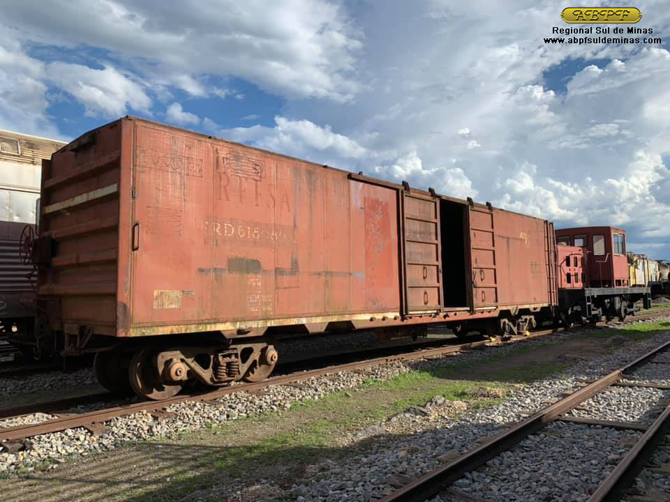 Vagão ‘box” FRD-618089-2G – Um “box” fabricado pela Energoinvest na Iuguslávia e montado pela CCC – Companhia Comercio e Construções em 1976. Antes um modelo abundante nas linhas de bitola métrica da antiga RFFSA, aos poucos está sendo substituído por modelos mais novos, tornando esse um exemplar significativo para a preservação. Ele foi alocado originalmente pela RFFSA na SR-8 – Superintendência Regional Campos. Desativado, estava na “fila da morte” que se formou no pátio de Praia Formosa, onde felizmente não foi cortado. Com as obras da região do porto do Rio, foi transferido com outros materiais e empilhado no então pátio do DNIT em Irajá.