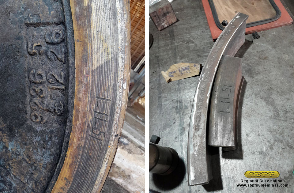 – Detalhe das marcações: na roda, feita pela própria Baldwin e no aro, pela EFCB quando de sua última troca, efetuada em 01/11/1951. À direita, os seguimentos que serão guardados.