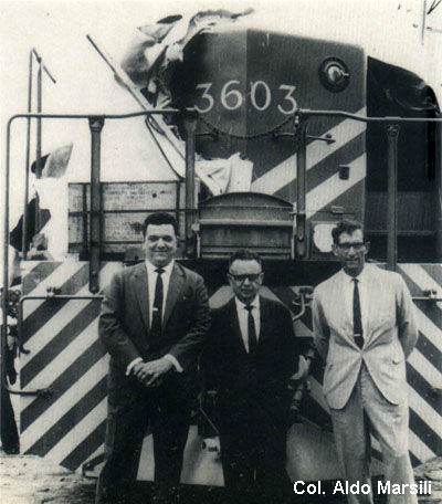 Os Diretores Wair Beraldo e José Vilhena posam para a foto junto à 3603, com o Chefe do Departamento de Mecânica, engenheiro Aldo Marsili – Foto col. Aldo Marsili