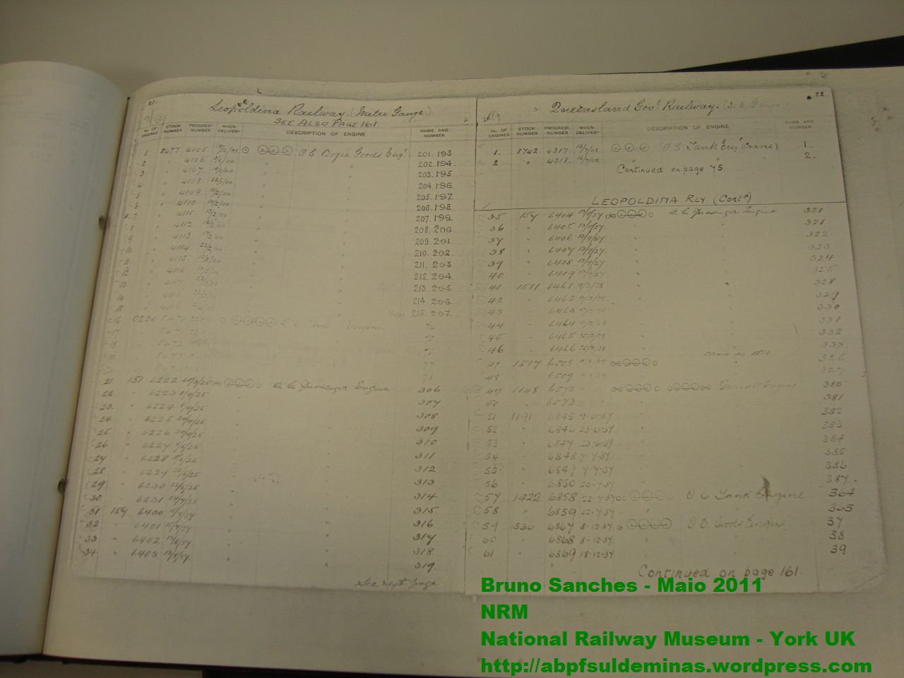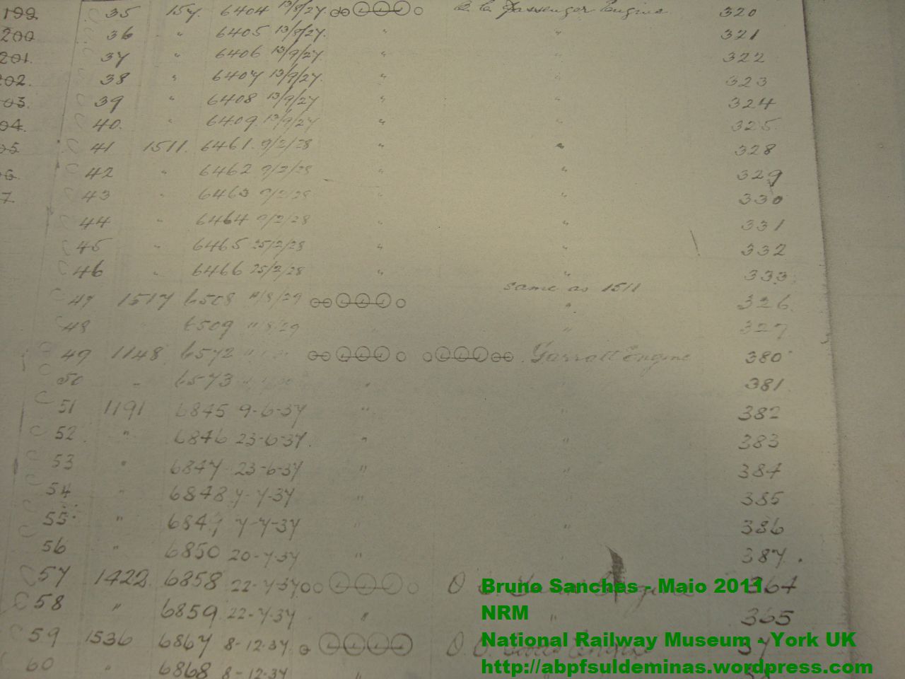 Um dos museus visitados foi o National Railway Museum em York, Inglaterra. O museu conta com dezenas de locomotivas a vapor preservadas e uma vasta biblioteca. Na biblioteca com auxilio dos prestativos funcionários do museu foi possível encontrar uma cópia dos registros da fábrica Beyer Peacok, onde foi localizado o registro da encomenda da locomotiva 327, que pode ser visto nas imagens abaixo: